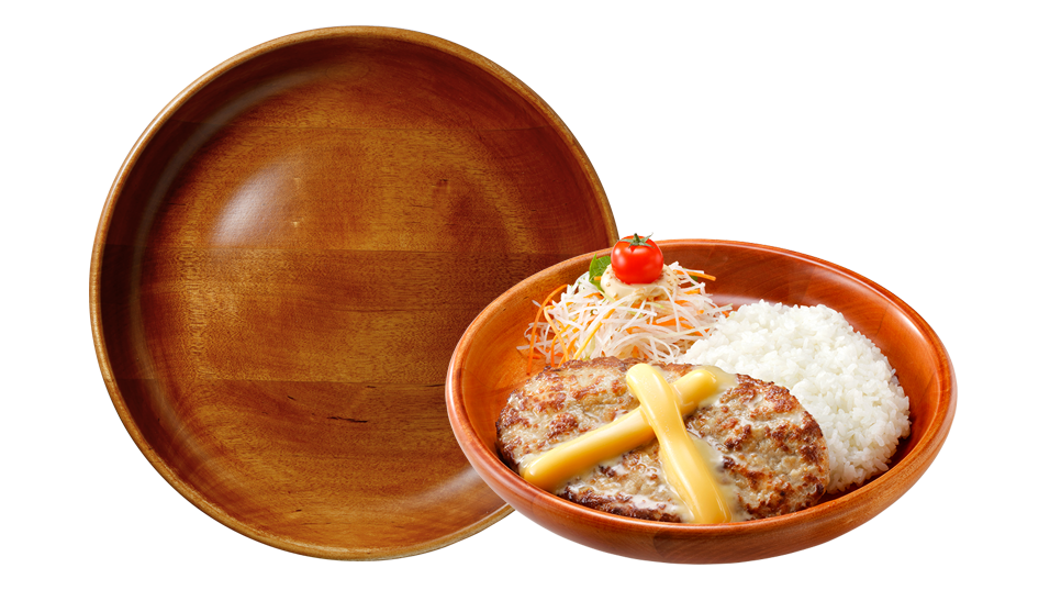 ハンバーグディッシュでおなじみの木製の皿は、主に樹液が取れなくなったタイ産ゴムの木の老木などを使用しています。また、傷ついたお皿は捨てず、削り直して、リユースしています。