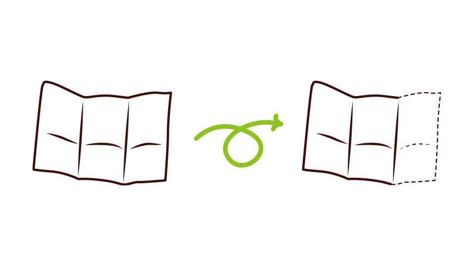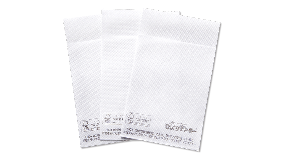 お店のテーブルに設置されている紙ナプキンは、環境と社会に配慮した森林・木材からつくられた「FSCマーク」がついています。さらに、以前は6つ折りだったサイズを4つ折りに縮小することで、素材の使用量を減らしました。