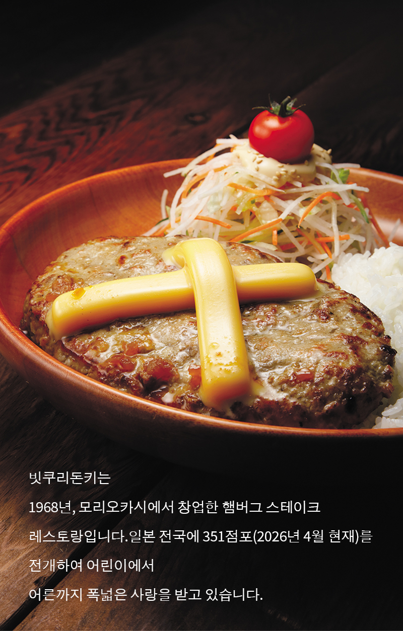 햄버그 스테이크, 샐러드, 라이스가 한 접시에 담겨 나오는 햄버그 스테이크 라이스/샐러드는 빗쿠리돈키의 대표적인 상품입니다.