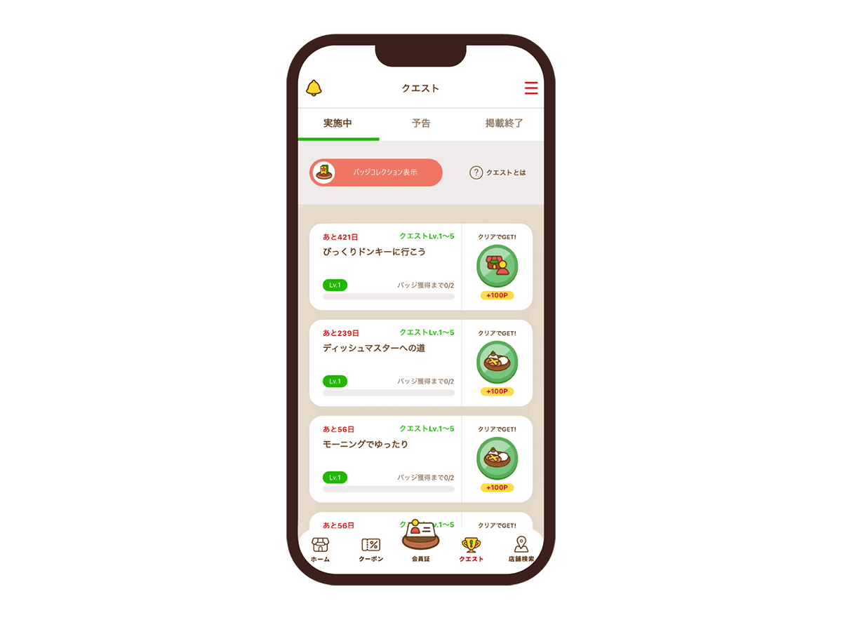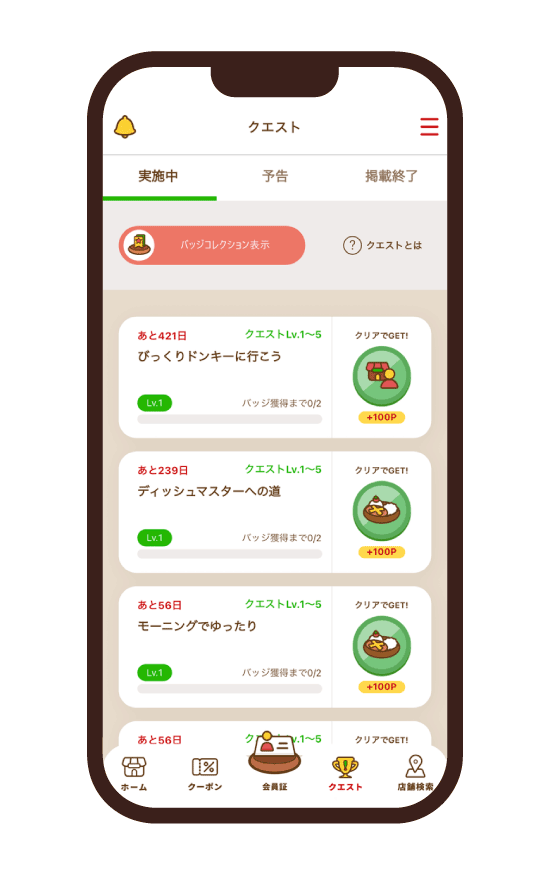 テーマごとのミッションをクリアするとバッジ(称号)とポイントがもらえる!