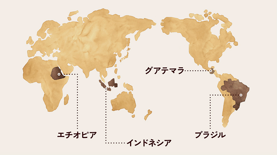 びっくりドンキーで使用している珈琲豆の原産国は、グアテマラ、エチオピア、ブラジル、インドネシアなど。産地と直に取引しているため「誰がどこで栽培した豆か」が明確です。