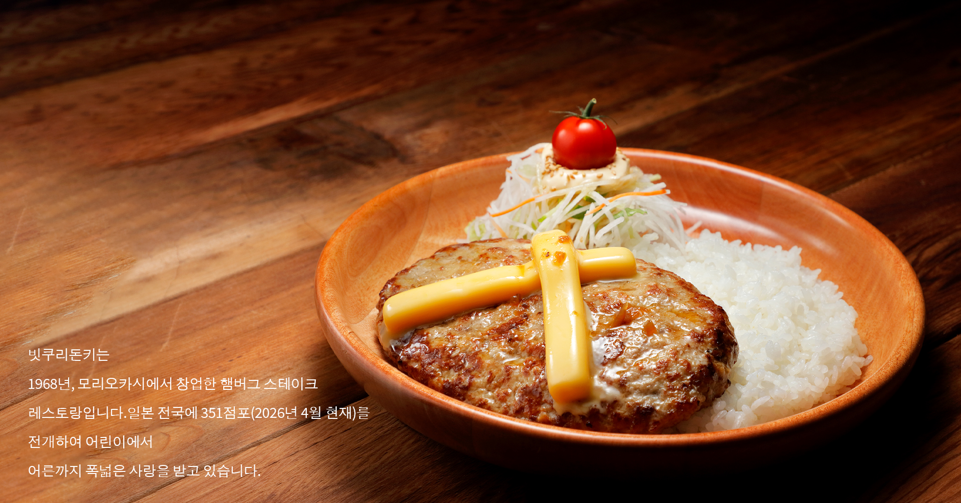 햄버그 스테이크, 샐러드, 라이스가 한 접시에 담겨 나오는 햄버그 스테이크 라이스/샐러드는 빗쿠리돈키의 대표적인 상품입니다.