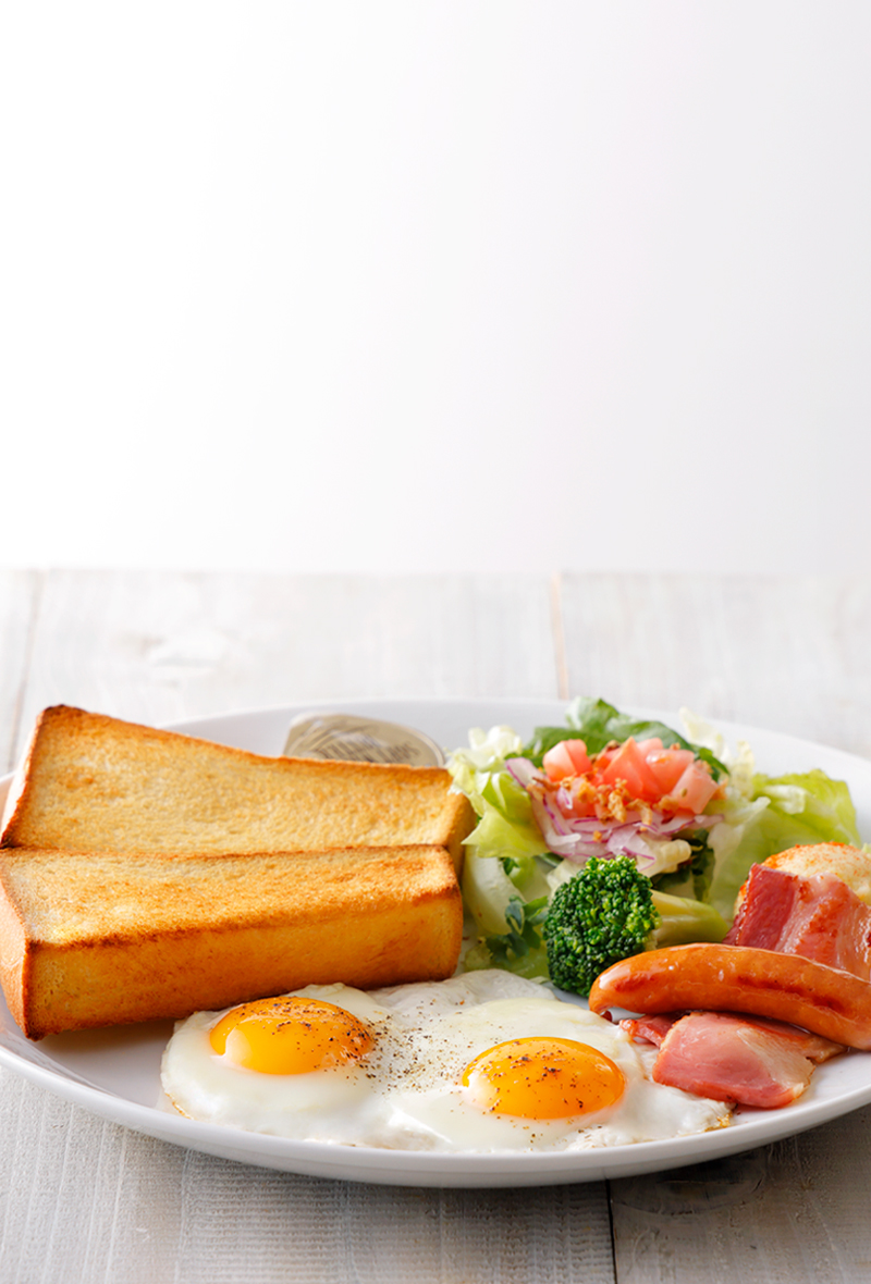 彩り鮮やかなサラダ、食べ応えのあるソーセージやベーコン、オーブンで焼き上げたトースト等をワンプレートに盛り付けました。目玉焼き・スクランブルエッグの2種類の卵料理からお好みのスタイルをお選びください。